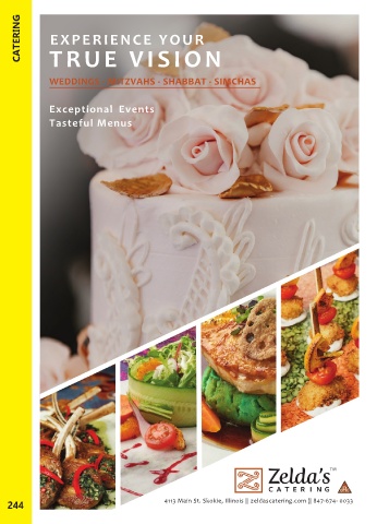 CATERING TRUE VISION EXPERIENCE YOUR WEDDINGS - MITZVAHS - SHABBAT - SIMCHAS Exceptional Events Tasteful Menus TM TM 244 4113 Main St. Skokie, Illinois || zeldascatering.com || 847-674- 0033