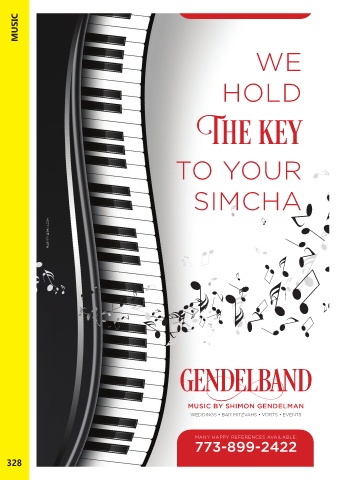 MUSIC WE HOLD THE KEY TO YOUR SIMCHA PLLEVITIN@GMAIL.COM GENDELBAND MUSIC BY SHIMON GENDELMAN WEDDINGS • BAR MITZVAHS • VORTS • EVENTS MANY HAPPY REFERENCES AVAILABLE. 773-899-2422 328