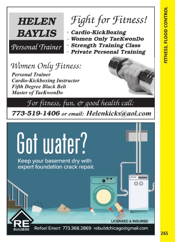 FITNESS, FLOOD CONTROL Got water? Keep your basement dry with expert foundation crack repair. RE LICENSED & INSURED BUILDERS Refoel Emert 773.368.2869 rebuildchicago@gmail.com 265