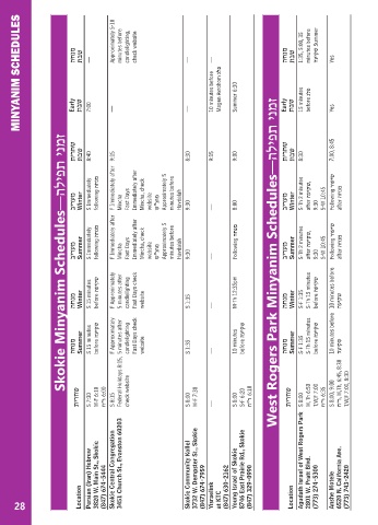 בירעמ Skokie Minyanim Schedules—הליפת ינמז Summer S Immediately following החנמ F Immediately after Mincha Fast Days Immediately after Mincha, check website ש”צומ Approximately 5 minutes before Havdalah 9:30 — Following החנמ West Rogers Park Minyanim Schedules—הליפת ינמז בירעמ Summer S-Th 2 minutes after העיקש, 9:30 S-