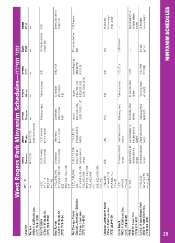 בירעמ West Rogers Park Minyanim Schedules—הליפת ינמז Summer — Following החנמ 20 minutes after העיקש 9:00 העיקש 8:30, 9:00, 9:30, 10:00, 10:30, 11:00 9:45 Following החנמ 30 minutes after העיקש Following החנמ M-Th 9:00